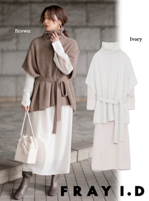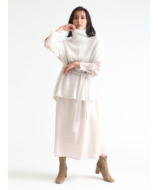 フォックス混のふんわりとした素材のハイネックポンチョと、さらりと心地いいデシンワンピースとのセットです。