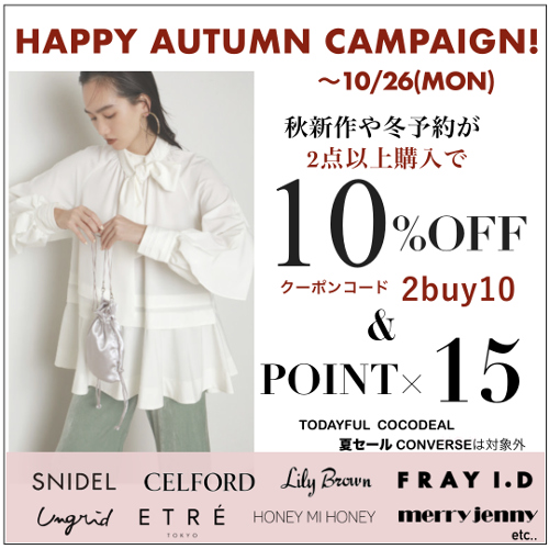 HAPPY AUTUMNキャンペーンスタート♪秋冬新作や冬予約が2点以上購入で10%OFFさらにポイント15倍♡コーディネートの決め手のアウターや新作アイテムをお得にGETするチャンス♪