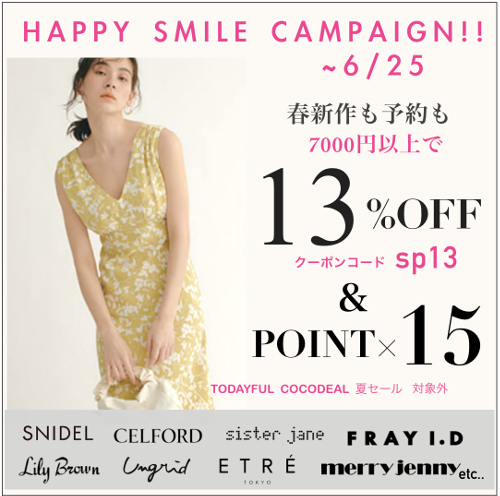 HAPPY SMILE CAMPAIGNスタート♪7000円以上で13%OFF! ポイント15倍!今欲しい夏小物や水着、Tシャツなどシーズンアイテムもお得♪