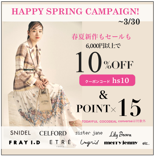 HAPPY SPRING CAMPAIGNスタート♪6000円以上お買い物で10%OFF!さらに15倍ポイント!新作もセールも対象!