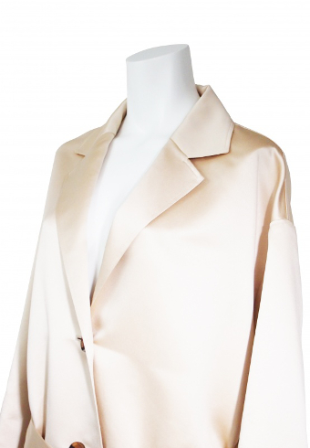 高級感のある厚手のサテン地が魅力のコートはさらりと羽織るだけでモードに◎