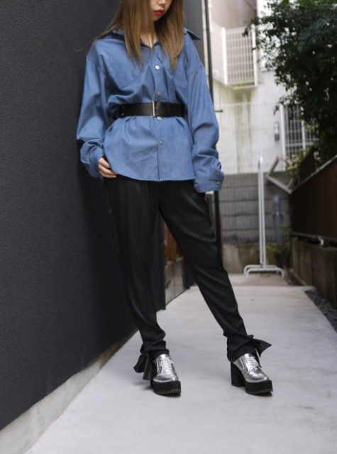 足首のリボンがアイキャッチーでガーリーな印象に。マスキュリンに決めたい日はリボンを取り外してシンプルなパンツへチェンジも可能の2way使用。