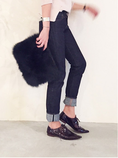 一見定番のすっきりデニムでも、裾を折ることでコーデにアクセントをプラス◎