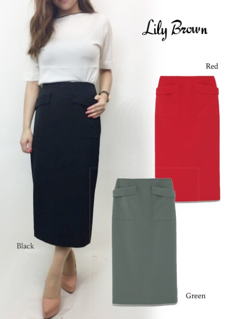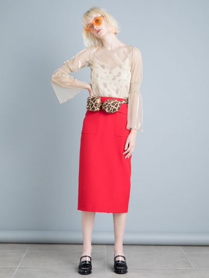 前面にあしらったビッグポケットがモードな印象のミドル丈タイトスカート。