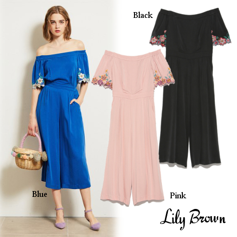スリーブのフラワー刺繍がフェミニンな、オフショルダーサロペット。