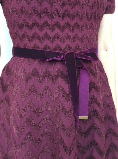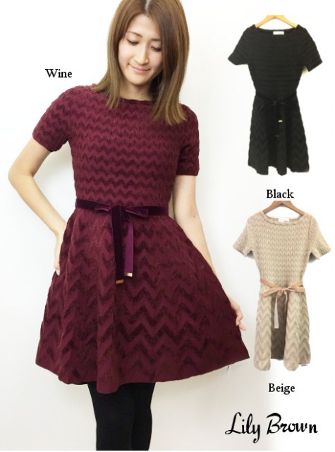 女性らしいラインのニットワンピースをベロア素材のウエストリボンを加えて、今季らしく仕上げました。