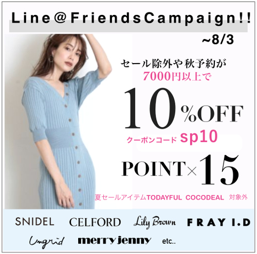 Line@お友達CAMPAIGNスタート♪7000円以上で10%OFF&ポイント15倍!秋冬の先行予約や、注目のコラボアイテムなどもお得♪