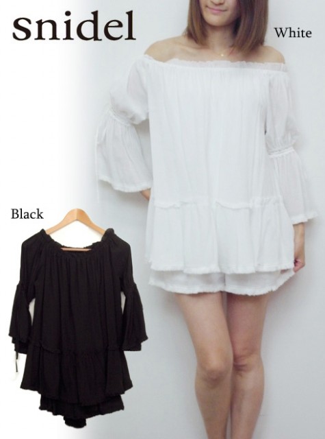 ガーリーなオフショルロンパースはリゾートにもぴったり♪