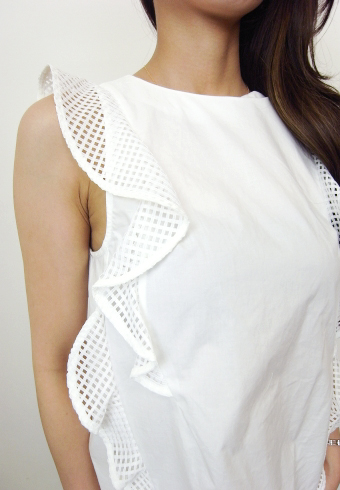 ひらひらと揺れるフリルが、華やかさを演出するノースリーブブラウス。