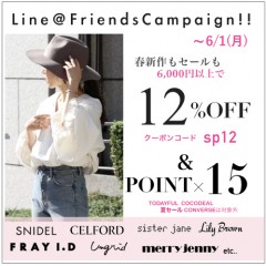 Line@お友達CAMPAIGN♪今回は6000円以上で12%OFF&15倍POINT★入荷したばかりの新作も予約もお得♪