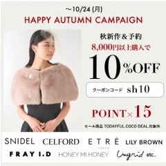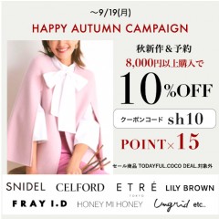 【 HAPPY AUTUMN CAMPAIGN スタート 】SNIDEL.CELFORDなど秋予約も 8000円以上購入で ★ 10%OFF&ポイント15倍 ★