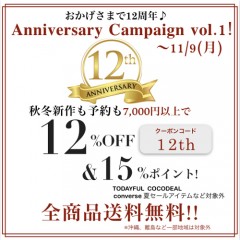 ☆おかげさまで12周年☆ご愛顧に感謝してキャンペーンスタート!!秋冬新作もなんと12%OFF&15倍POINT!さらに全商品送料無料♪