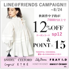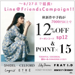 好評につき延長!Line@お友達CAMPAIGN★7000円以上でなんと12%OFF&ポイント15倍! 秋冬先行予約や新作をお得にGET♡