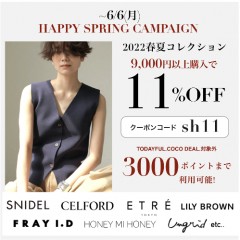 【 HAPPY SPRING CAMPAIGN スタート 】春夏コレクションが9,000円以上のお買い物で★なんと11%OFF★さらに【3000ポイント利用可能】~6/6(月)