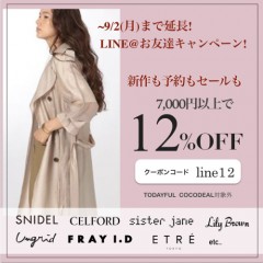 好評につき延長決定!!SNIDEL.CELFORDなど人気ブランドが【7000円以上でなんと12%OFF】LINE@お友達キャンペーン♪