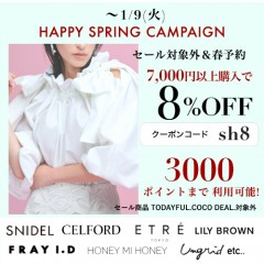 【 HAPPY SPRING CAMPAIGN START 】SNIDEL,FRAY I.D,ETRE TOKYOなど春夏新作&予約も 7000円以上で ★ 8%OFF&さらに3000ポイント利用可能 ★