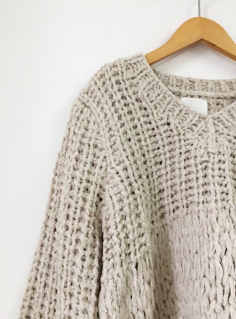 袖、裾部分で編み方が異なるデザイン性のあるニット。