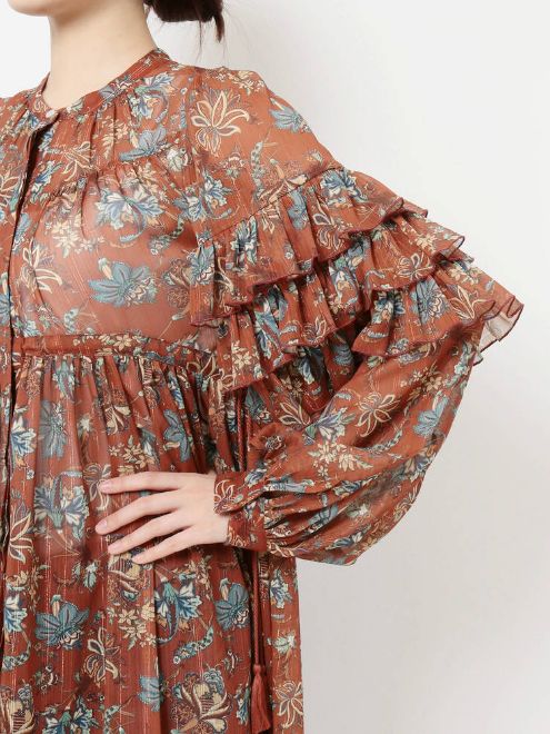 シアー素材にオリジナルのテキスタイルを落とし込んだフリルワンピース