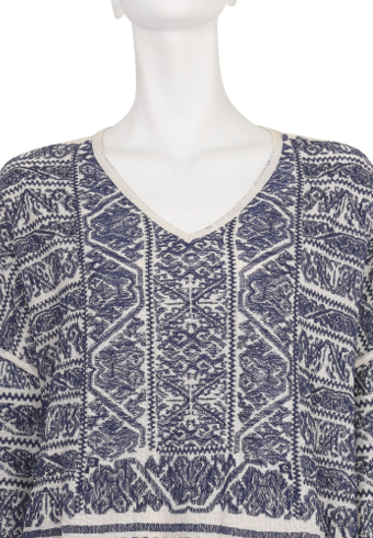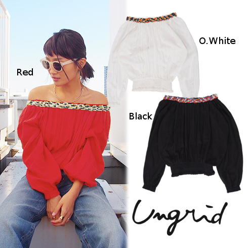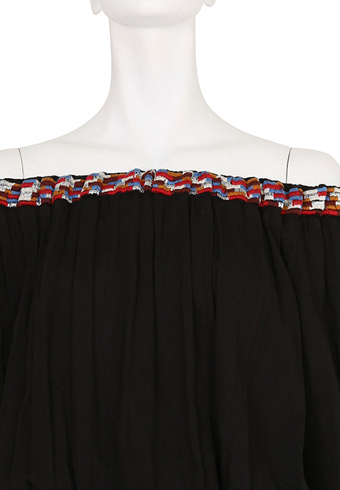 今季のコンセプトをイメージした、カラフルな襟周りのカラー刺繍がポイントのオフショルダータイプのブラウス。